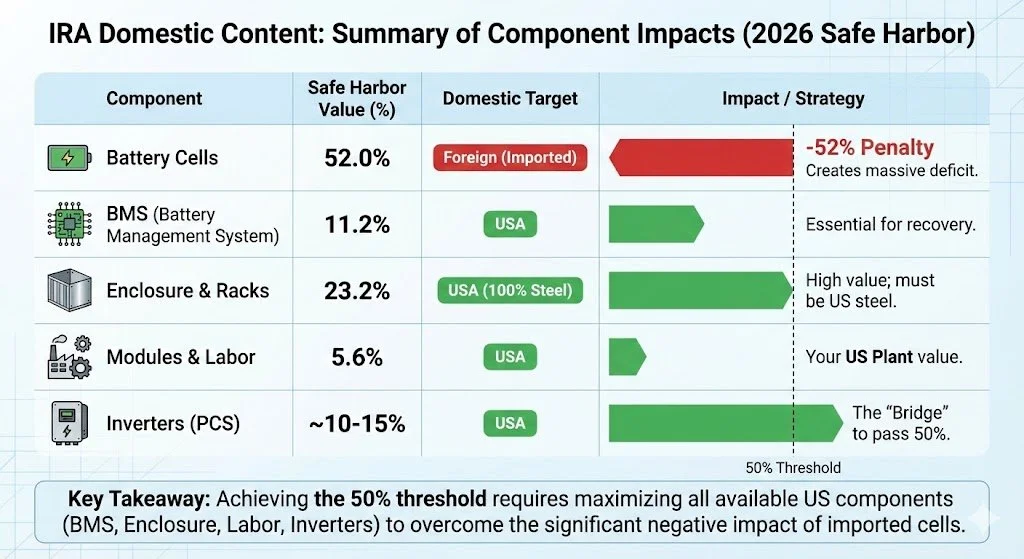 Scenario A: Centralized AC Inverter (+15% Value): By including a separate, U.S.-manufactured central inverter, your total domestic percentage rises to ~60.6%, safely passing the threshold.