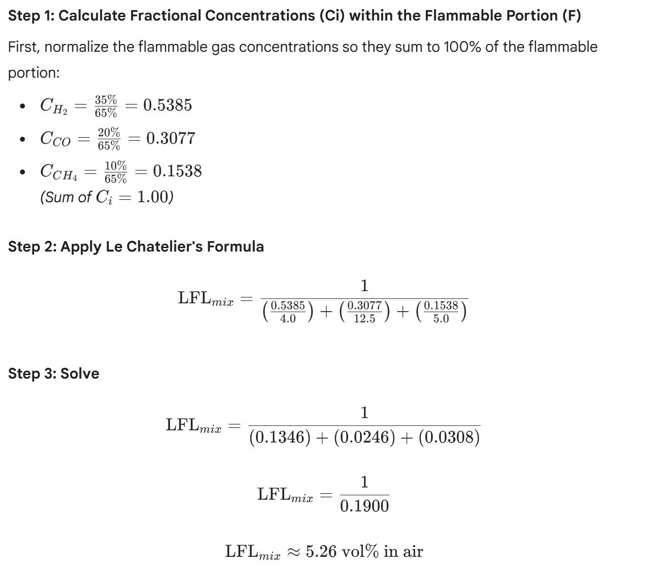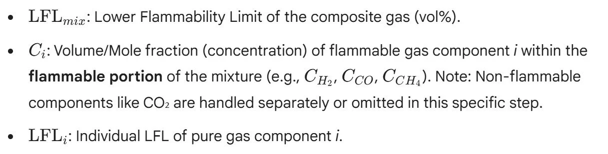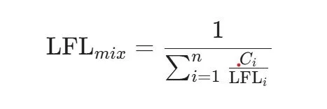Each flammable component has its own pure LFL. The goal is to determine the aggregate LFL mix of this unique, composite gas. The universal method to do this is Le Chatelier's Law, which states that the LFL of a mixture is the inverse of the sum of the fractional LFL contributions of each component.
