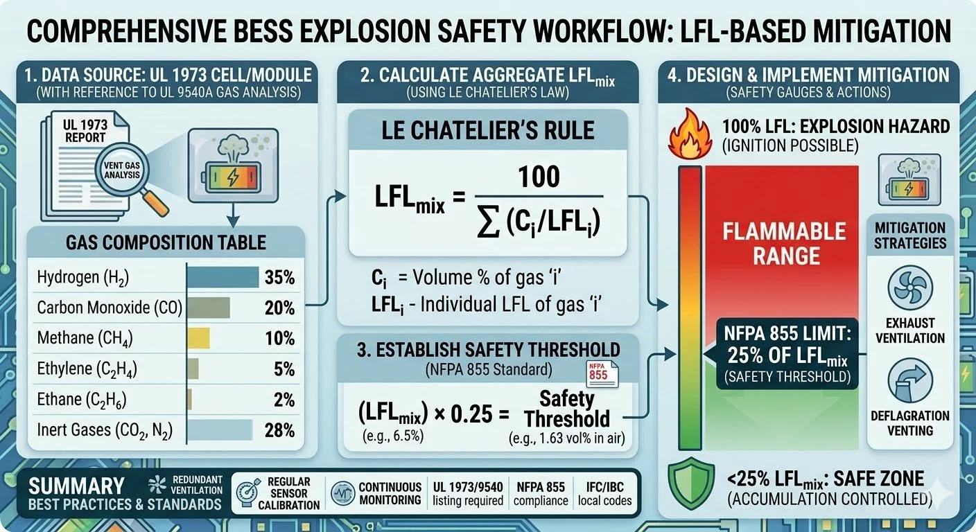 The absolute critical safety bound in BESS design is the conservative threshold of 25% of the aggregate LFL. For our worked example: