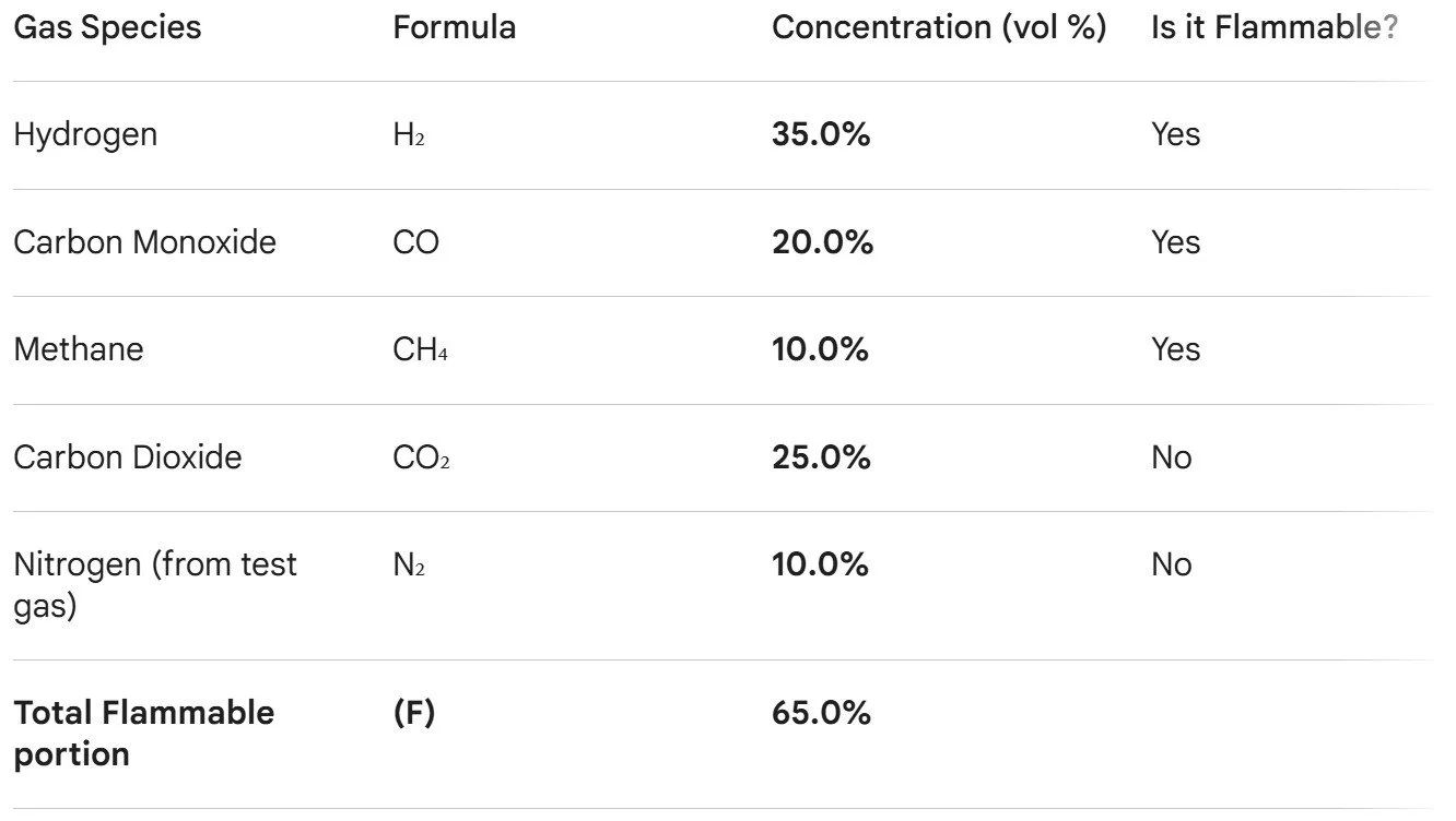 Let's assume a UL 9540A report for an LFP (Lithium Iron Phosphate) cell provides the following outgassing composition. Note: This data is representative; always use the actual data from the report.